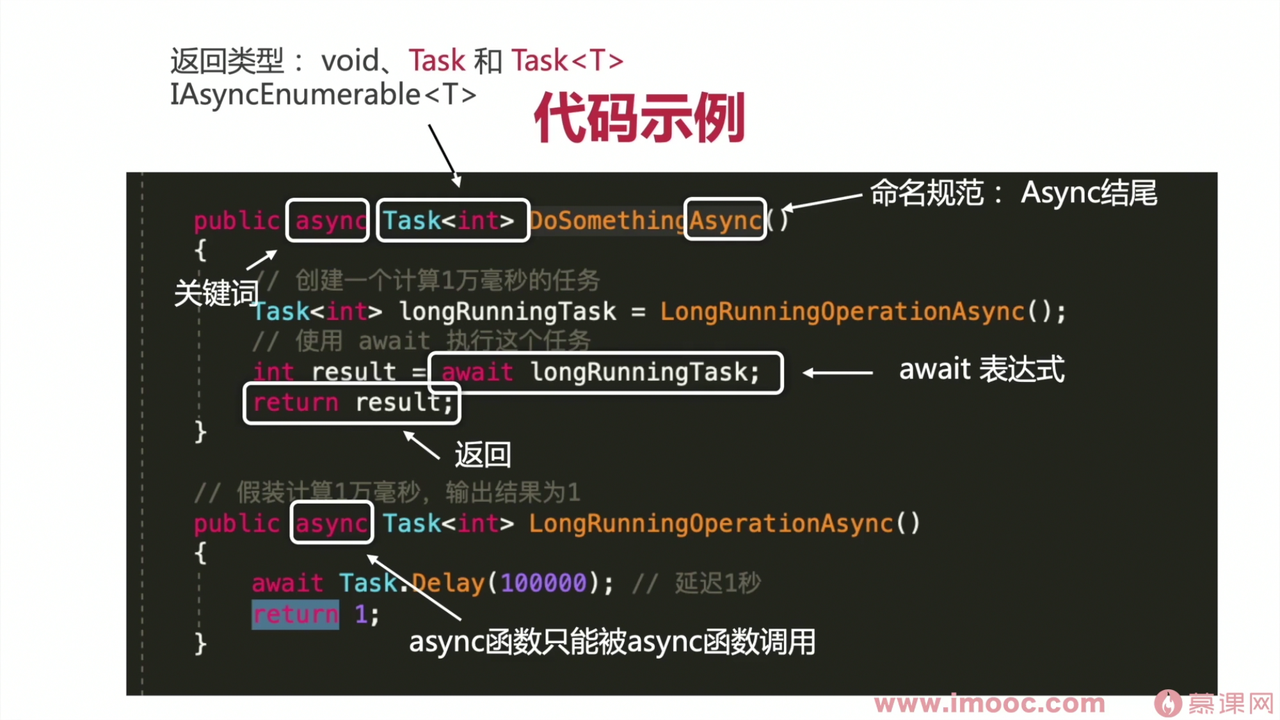异步处理并行操作,多个线程同时执行。通常用Task。